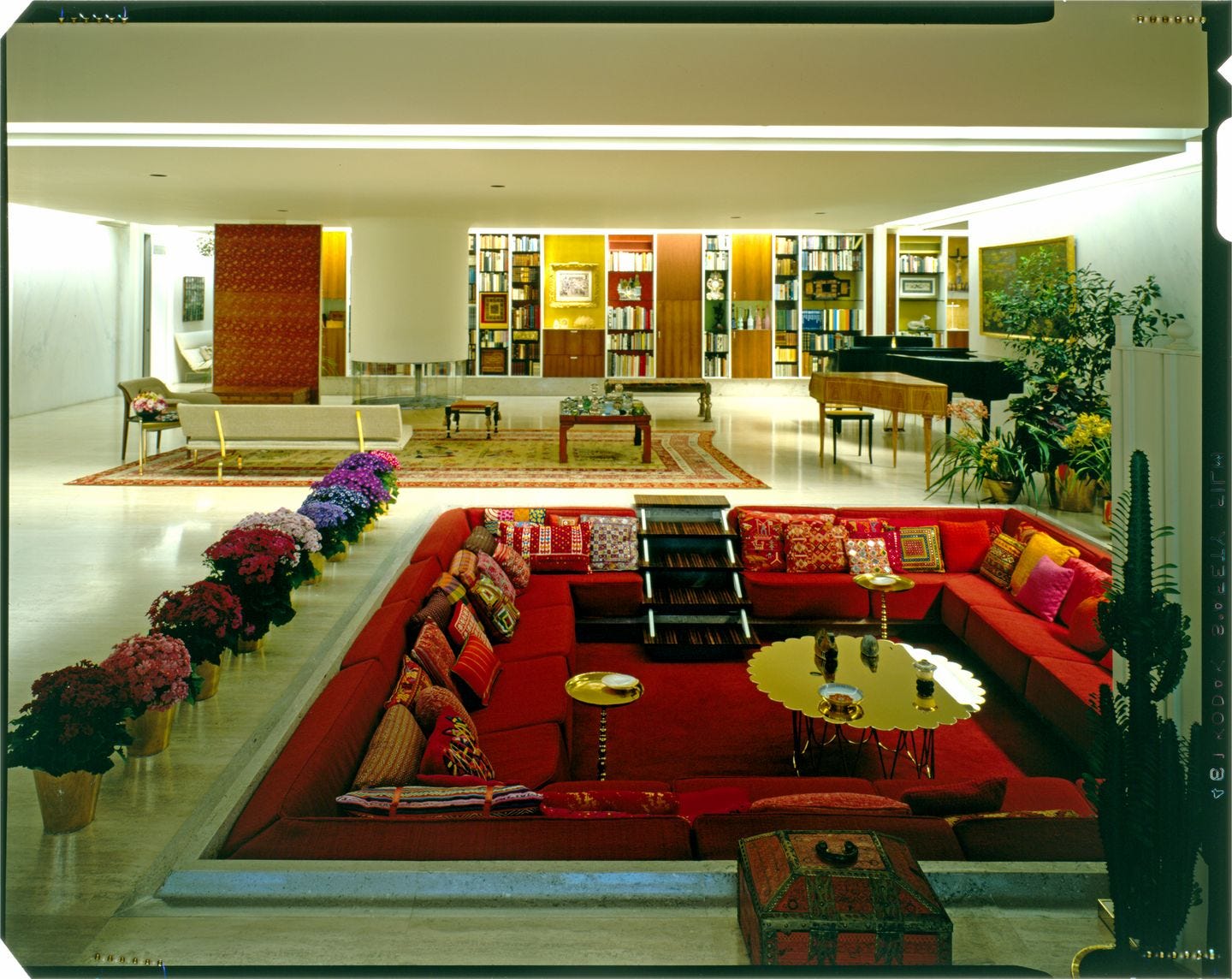 En 1957, Eero Saarinen y Alexander Girard usaron una estructura empotrada para configurar la sala de estar de la Miller House en Columbus, Indiana.