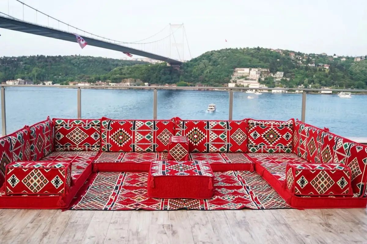 Mira el Majlis árabe, un concepto árabe y persa que significa “consejo” o “asamblea”. Todo son cojines y tapices. Asientos modulares para mover y cerrar en círculo. Sentados alrededor de una mesita para el té. Lugar de reunión, celebración de bodas, negocios…